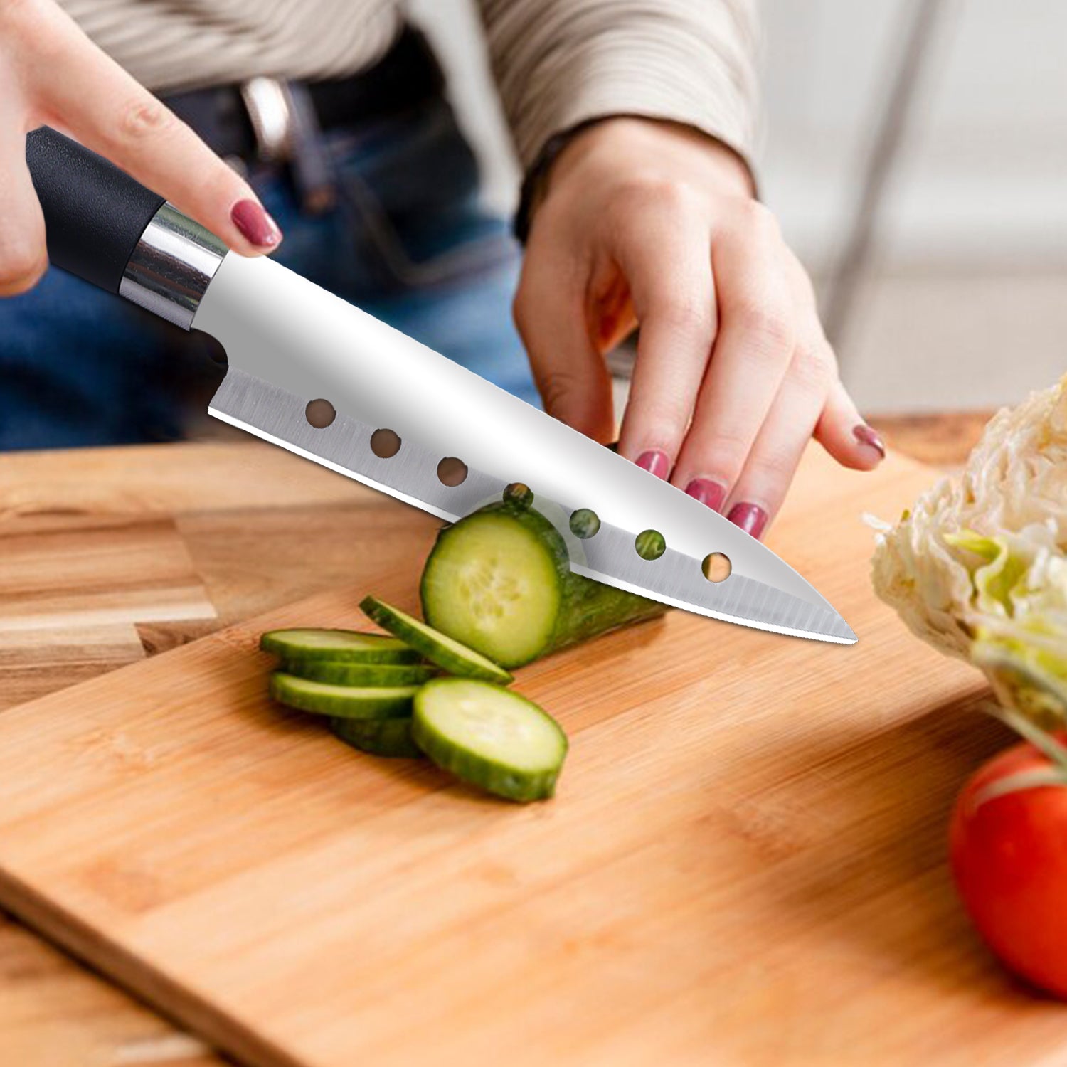 - Stainless Steel Blade with Anti-Stick Design : Designed with air holes to reduce friction and food sticking, making it an ideal cooking knife and stainless steel knife for smooth, efficient cutting.