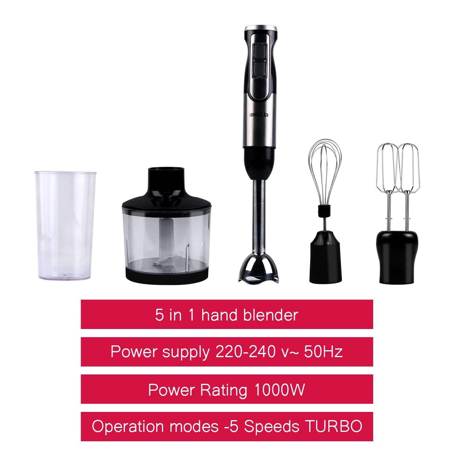 iBELL HB1000J 5-in-1 Hand Blender, 1000Watt, Adjustable Speed Control, Hand Mixer with Whisker/Beater, Immersion Blender, Vegetable Chopper & 600ml Container (Black)