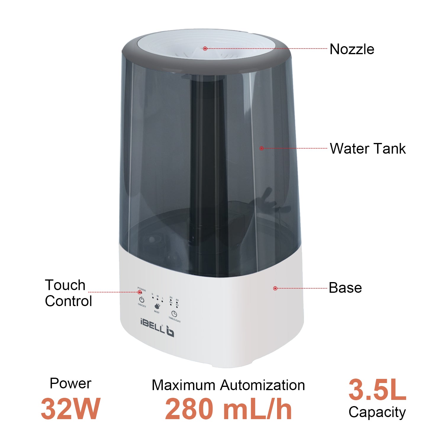 iBELL HU350P Humidifier – 3.5 L Capacity, Ultra-Quiet Operation, 360° Rotating Nozzle, Adjustable Mist Control, Ambience Lights, Up to 24 Hours Continuous Run Time (Black)