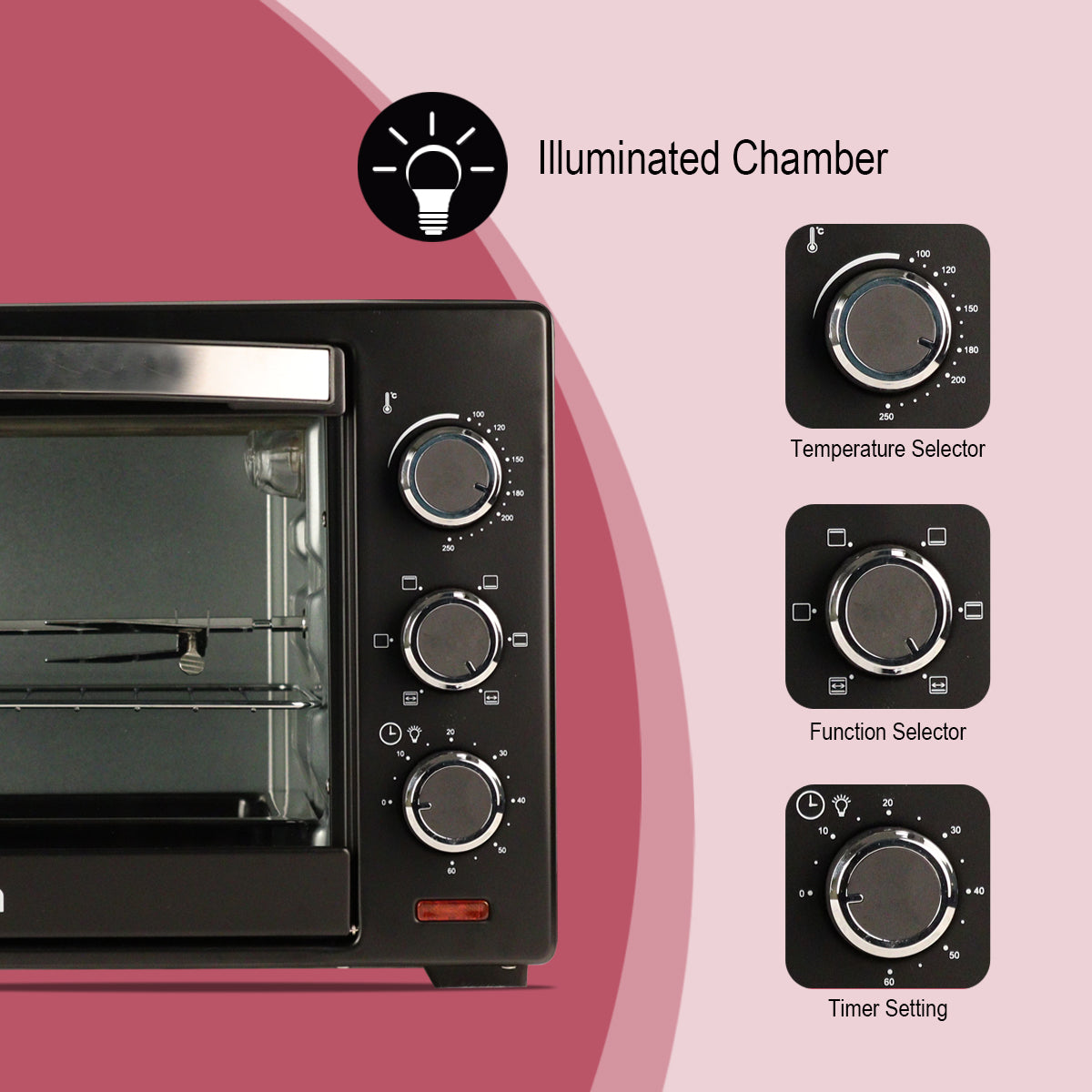 - 1600W Power, 60 Minute Timer with Inner Light Technology, Rotisserie Function, Full Black Housing, 25L Big Capacity, AC 230V, 50Hz