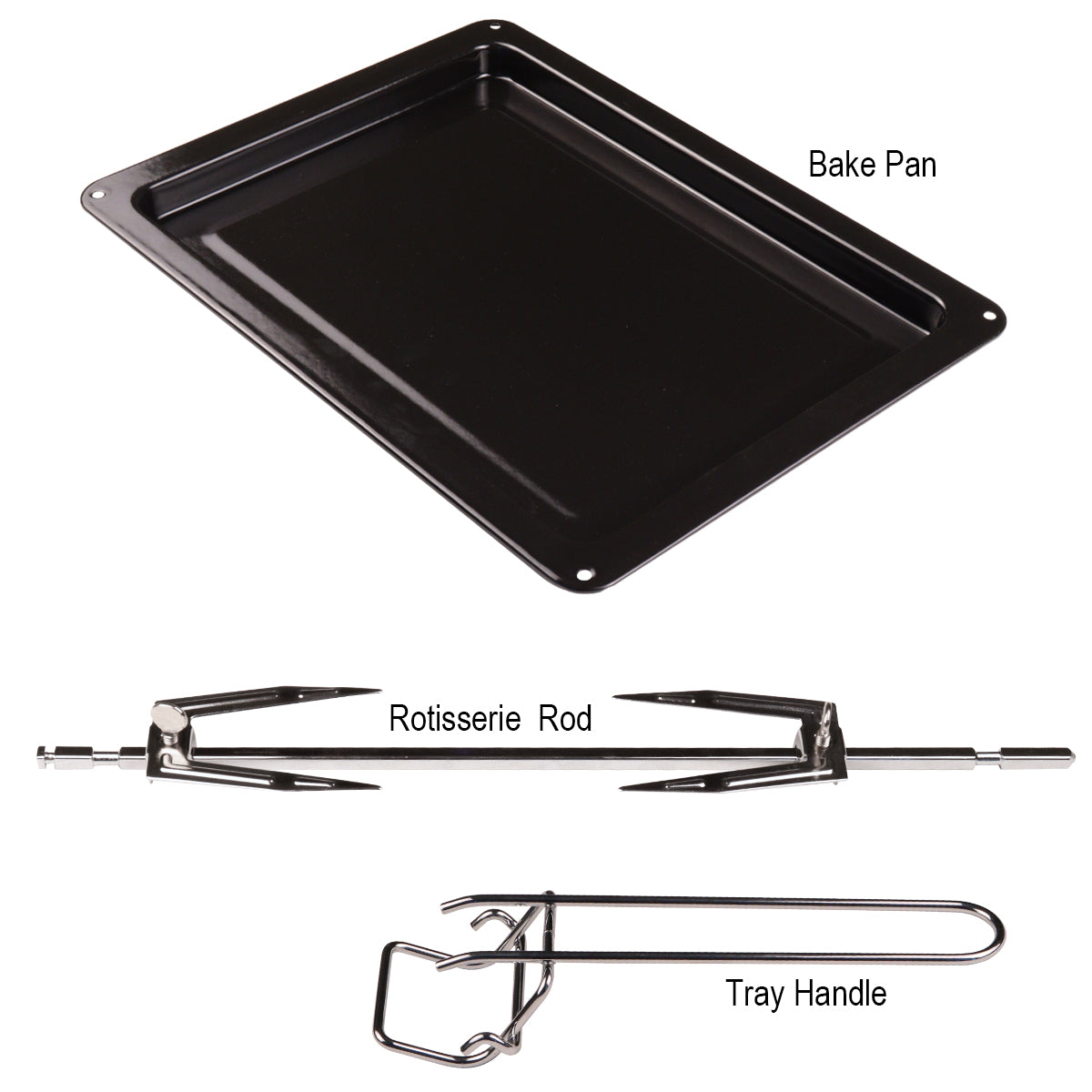 - LIST OF COMPONENTS 1. Oven indicator 2. Timer 3. Operation selector 4. Temperature selector 5. Door handle 6. Bake rack 7. Bake pan 8. Tray handle 9. Heating elements 10. Bottom door clip 11. Rotisserie rod 12. Rotisserie handle