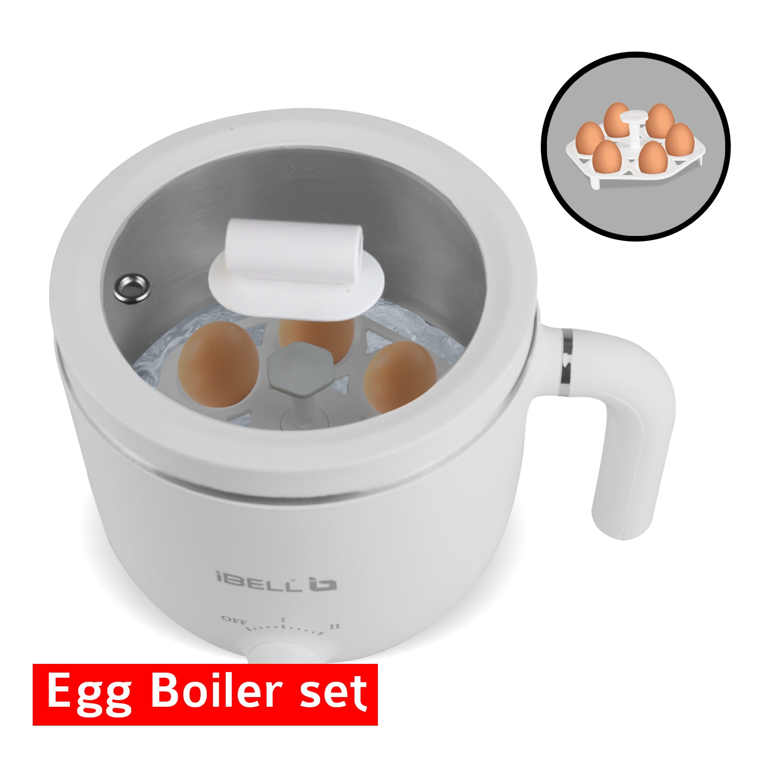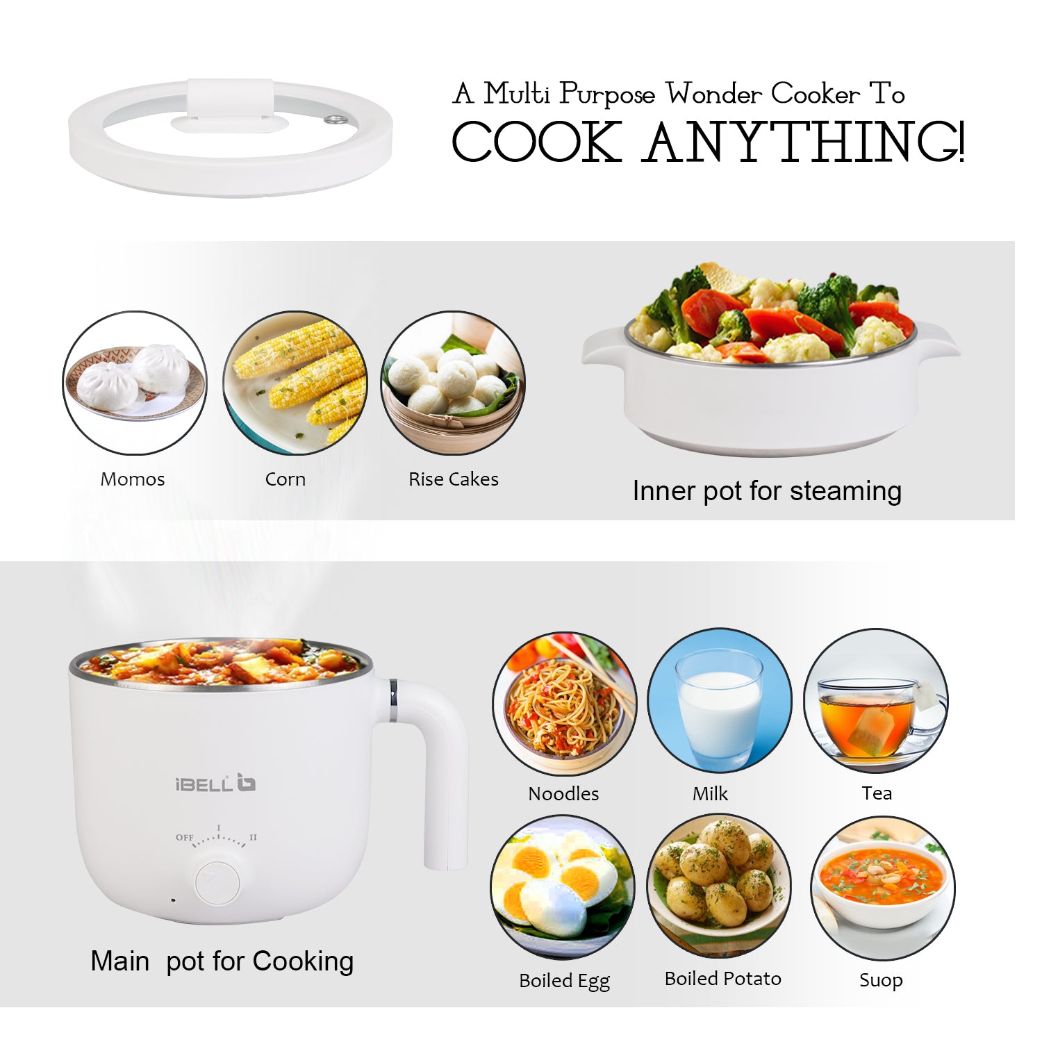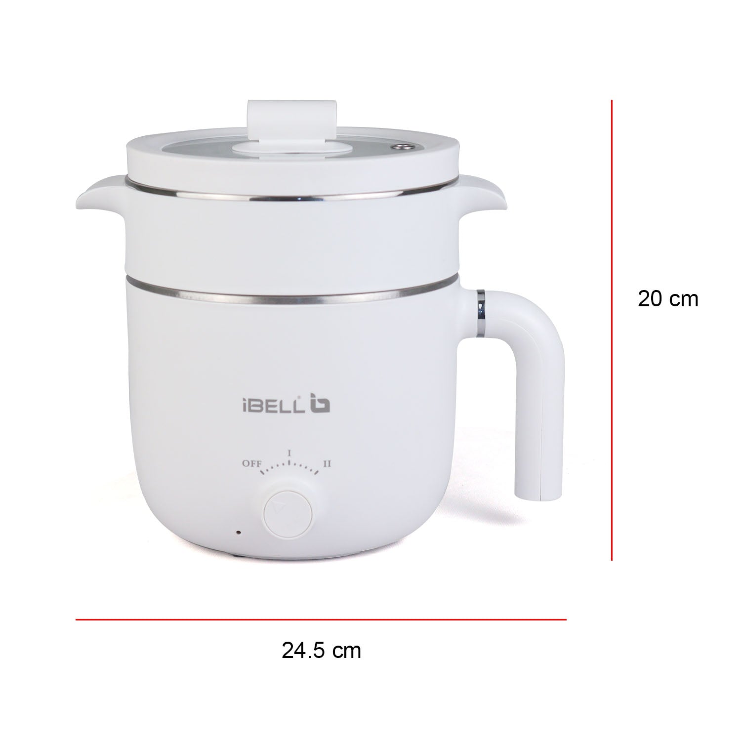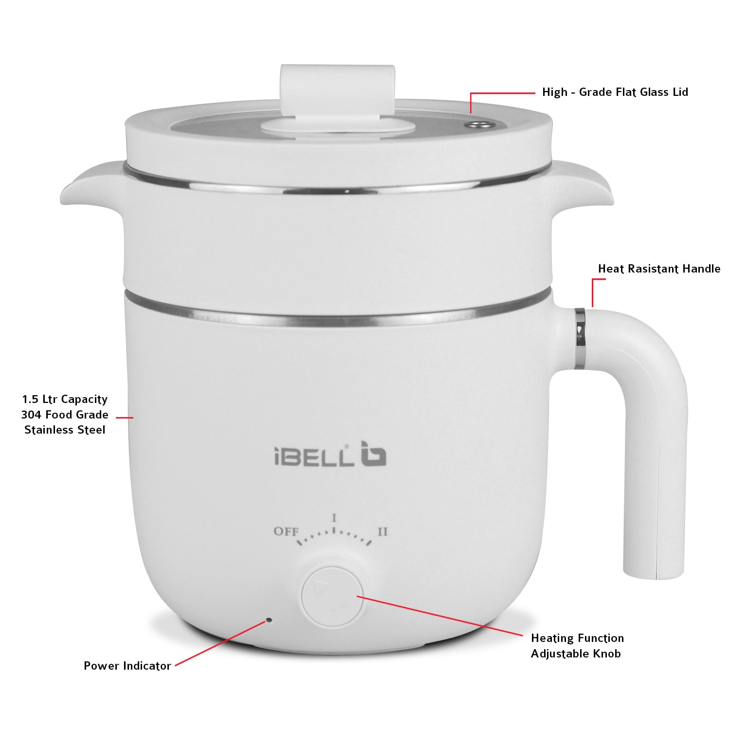 IBELL MPK15M Multipurpose Electric Kettle, 1.5 Litre, 800W, 2 Cooking Pots & Egg Boiler, Temperature Control, For boiling Water, Egg, Stainless Steel Body (White)